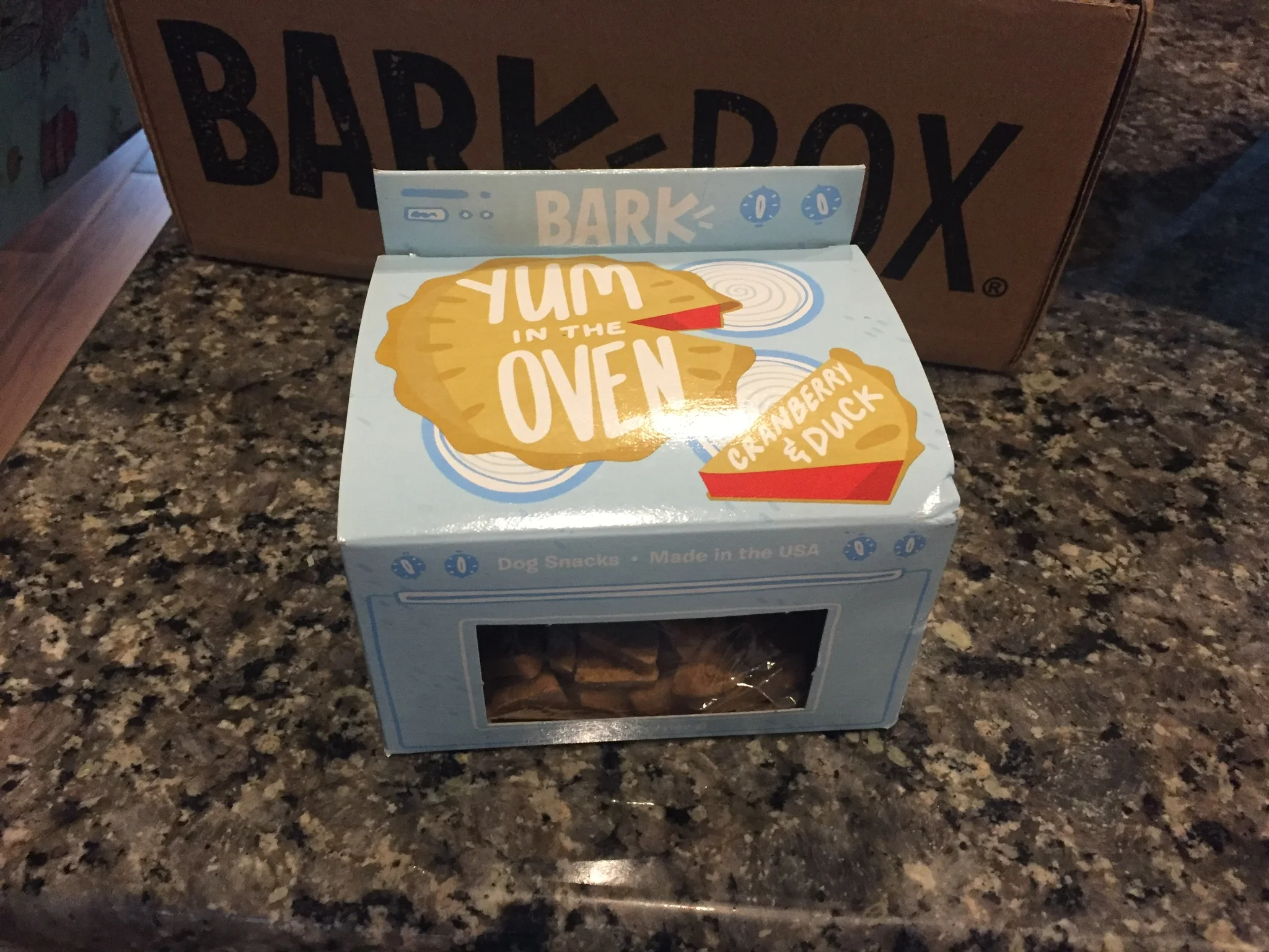 The November treats included some cranberry and duck treats shaped like pie wedges and in a box that looks like an oven. Cute!