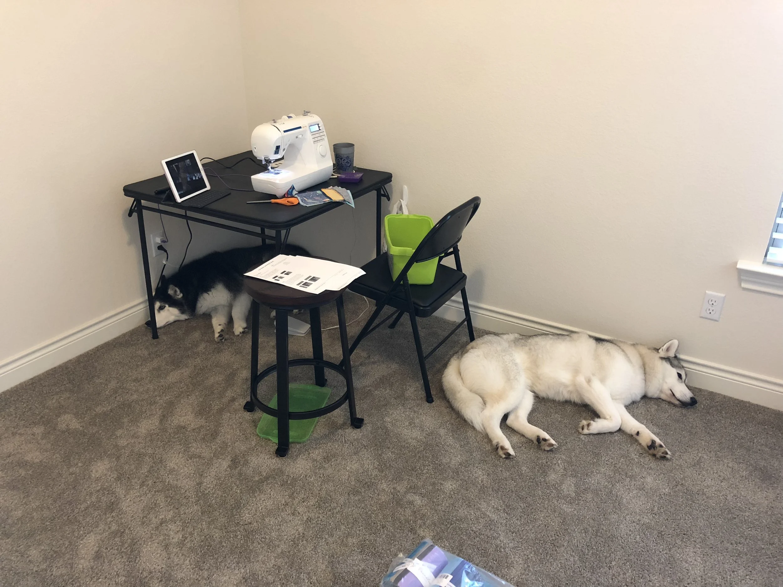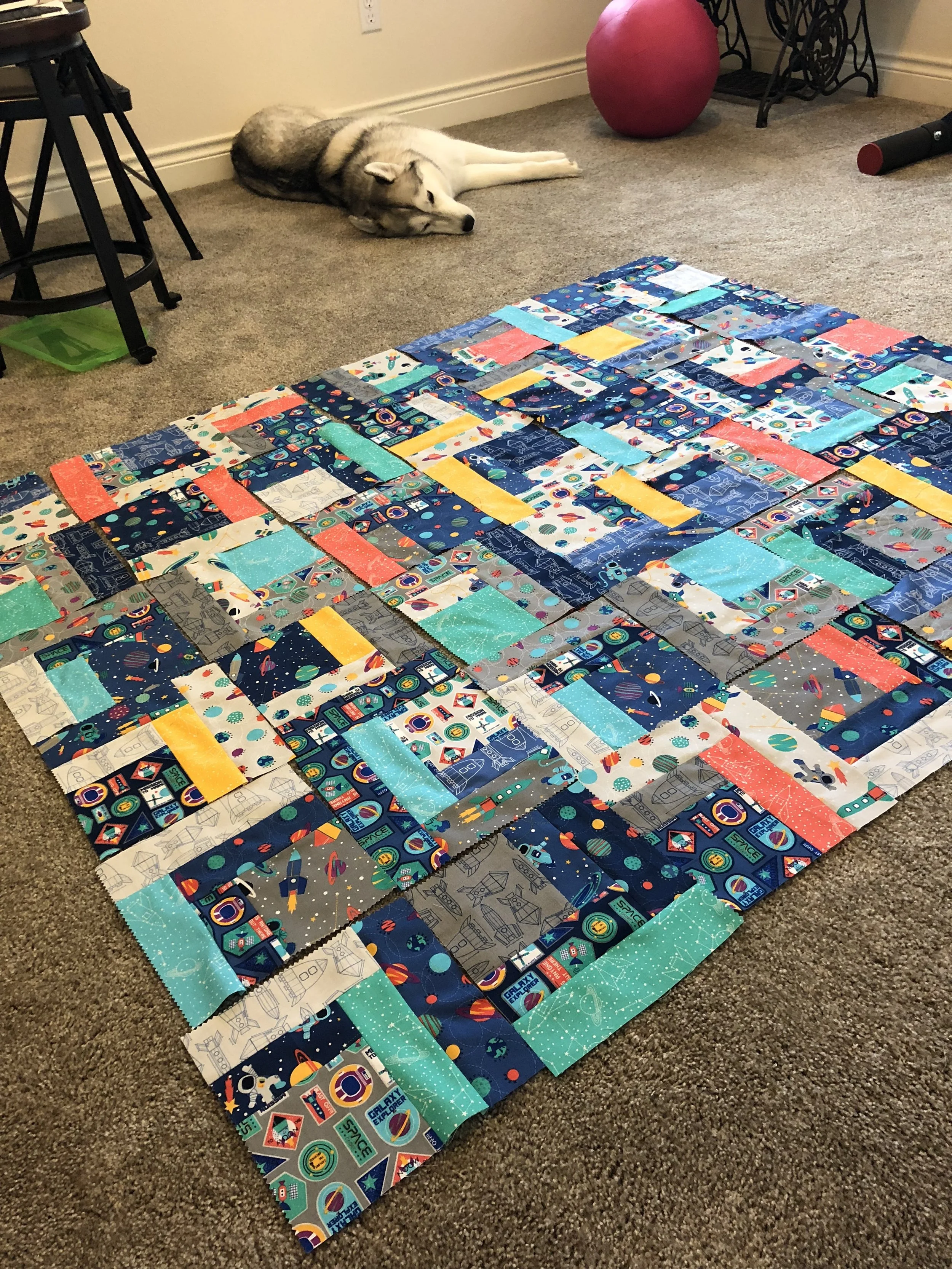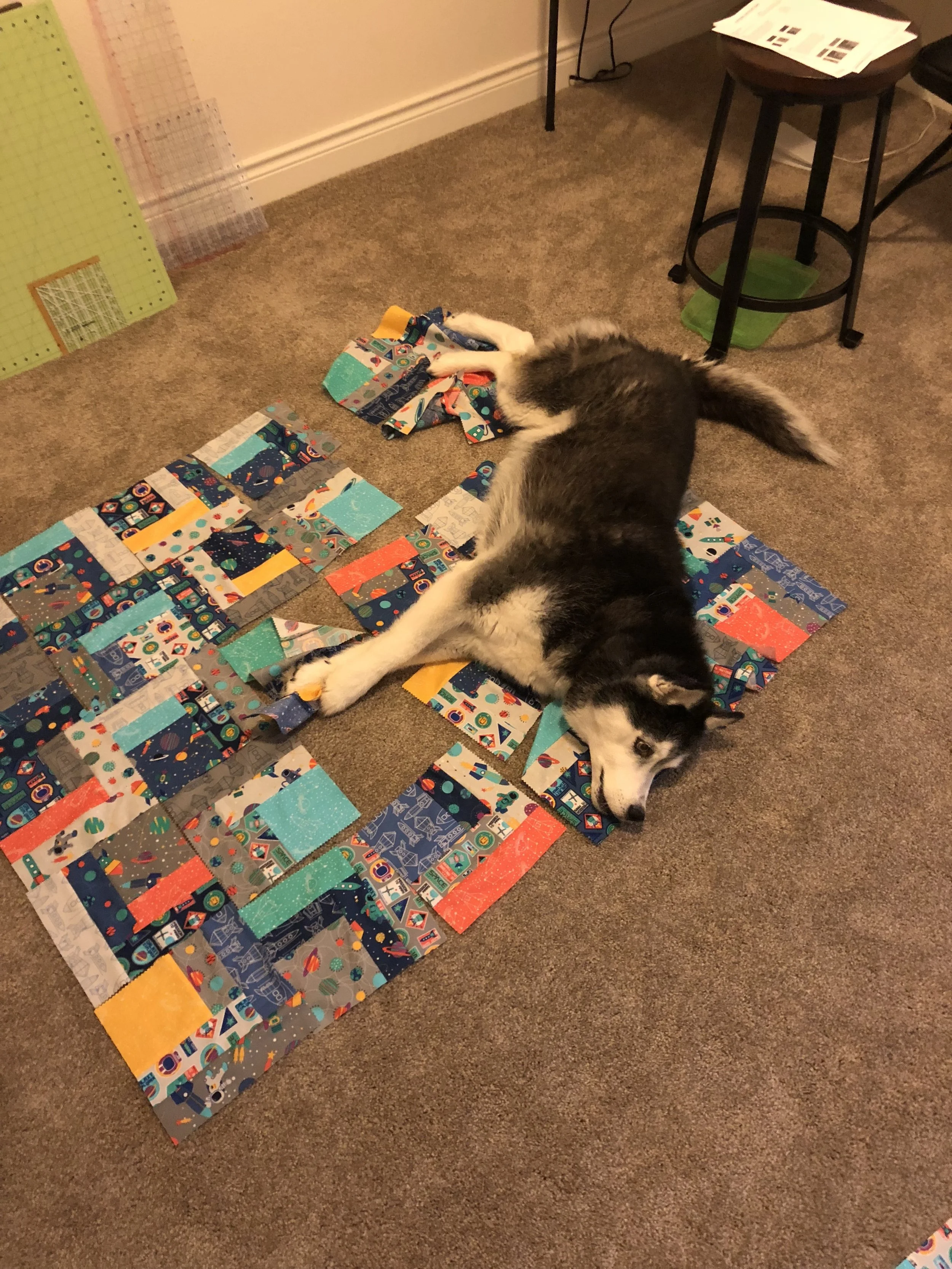 This past weekend, I made quite a bit of progress on Gus’s quilt. I finished all the blocks thanks to my trusty helpers.