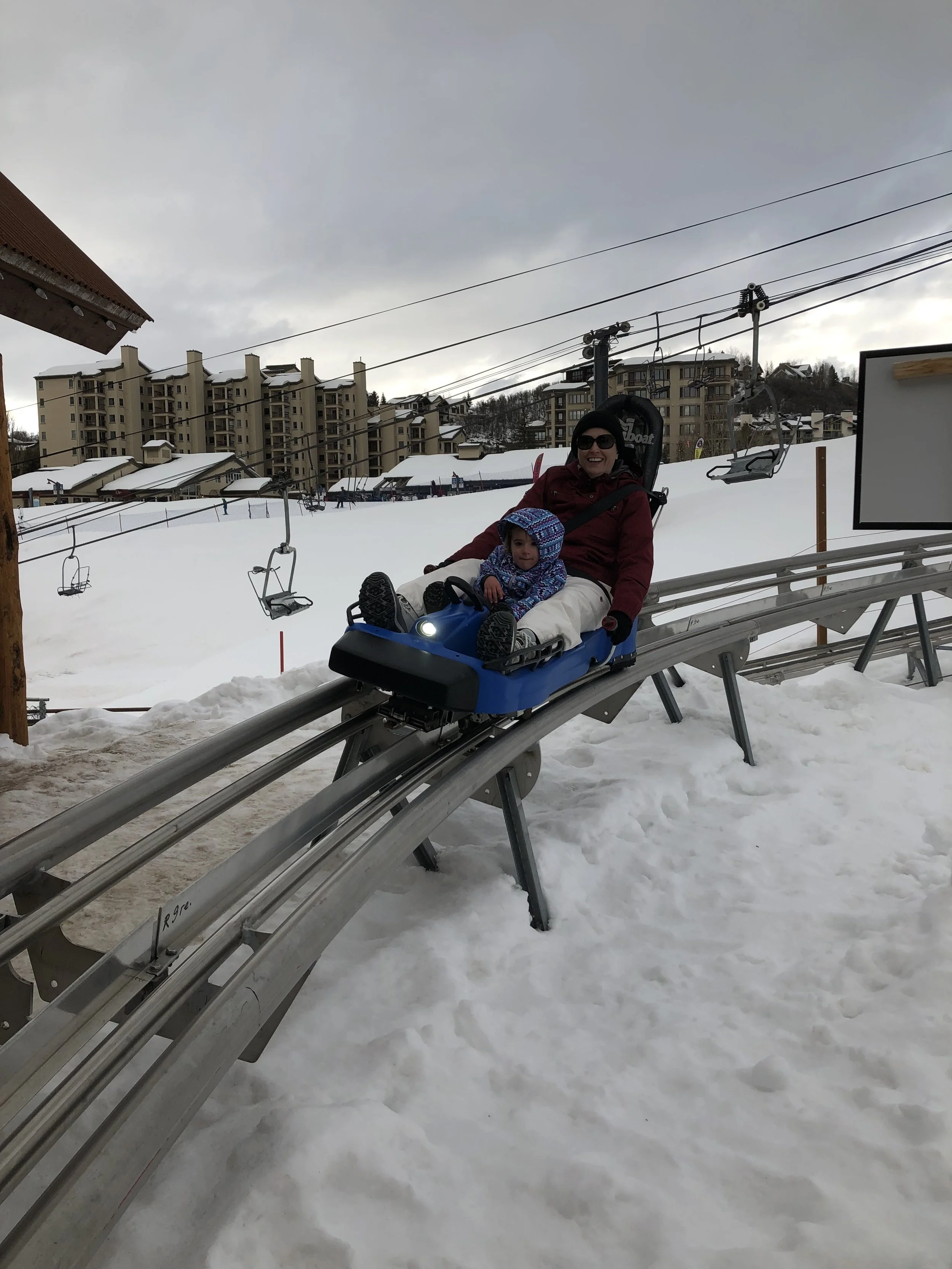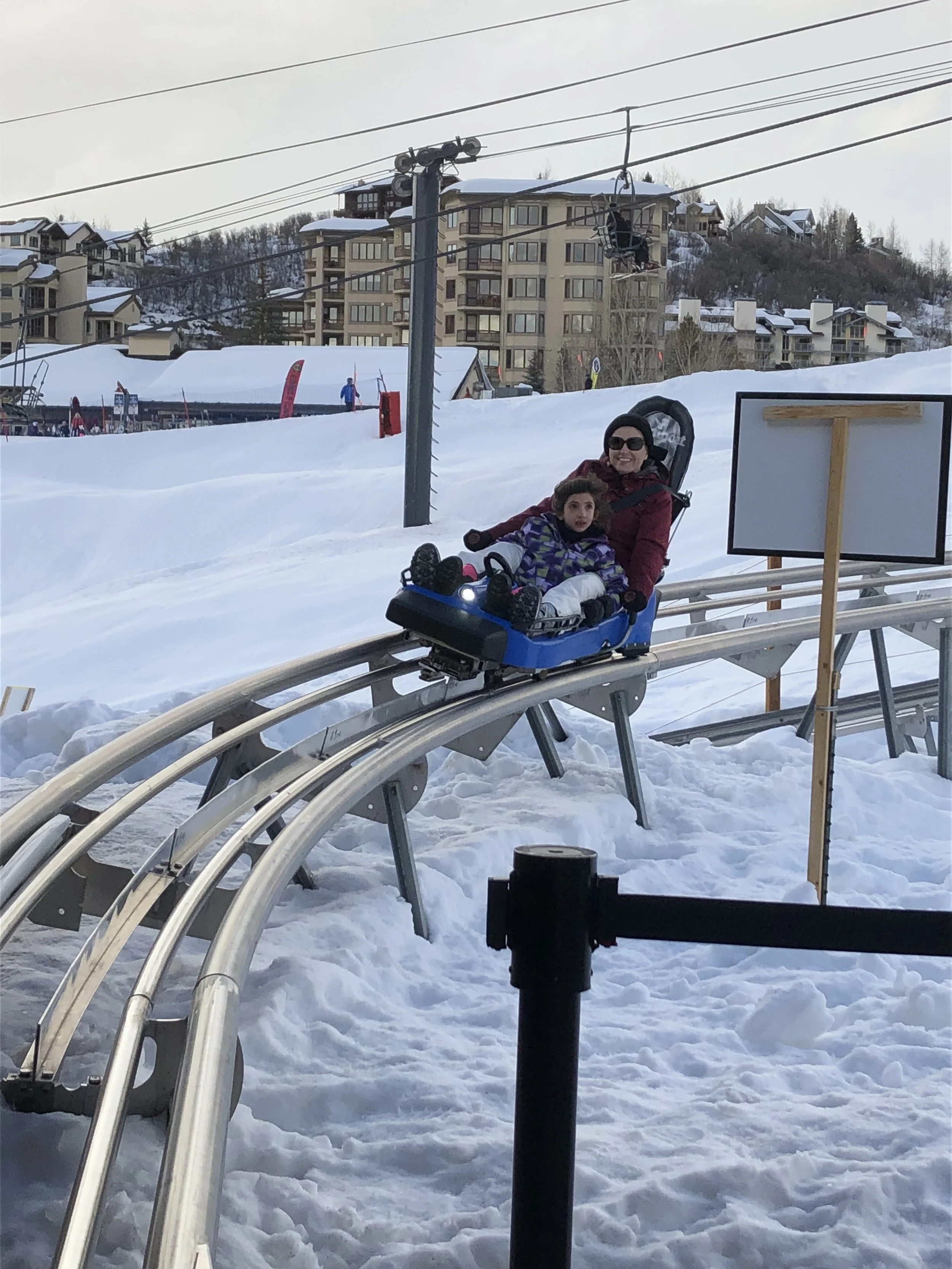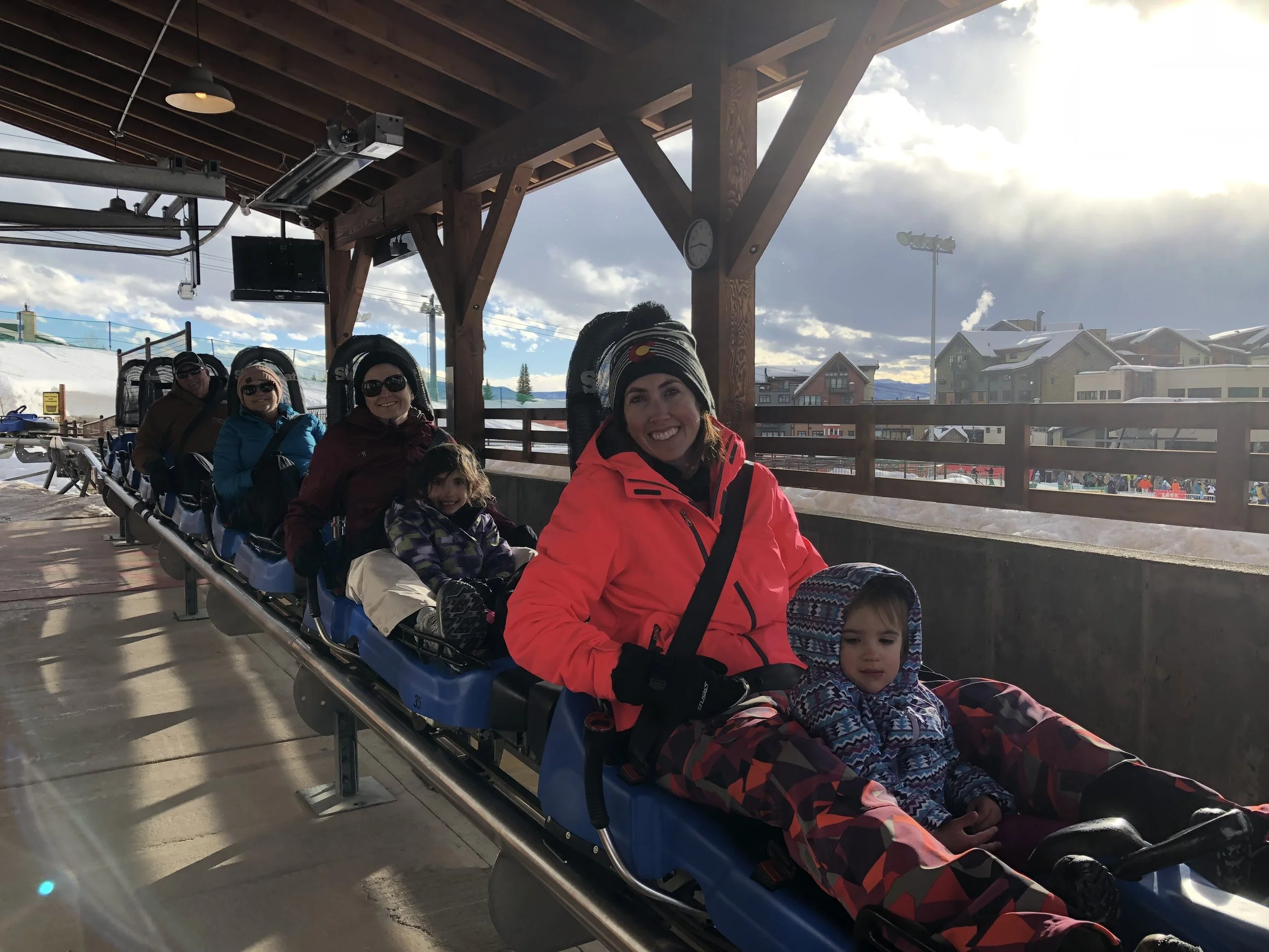 After we got back from snowshoeing one day, I went with Kasyn, Lakyn, Kari, Mom, and Dad to ride the mountain coaster at the ski resort. It was expensive but so fun that we rode twice!