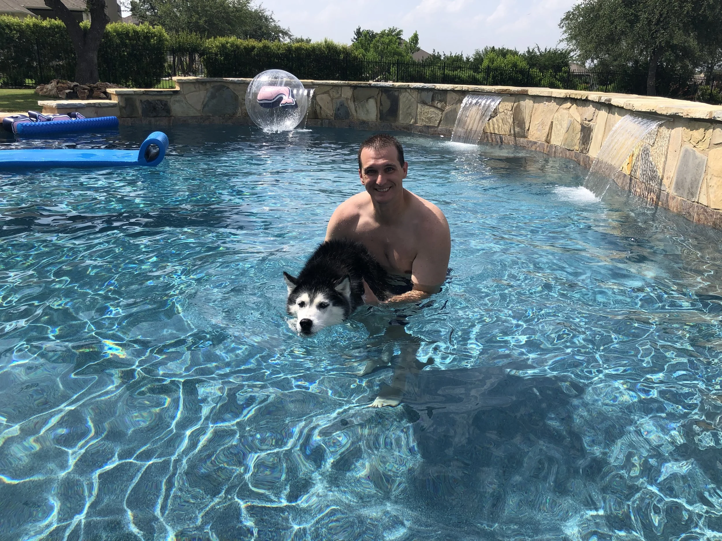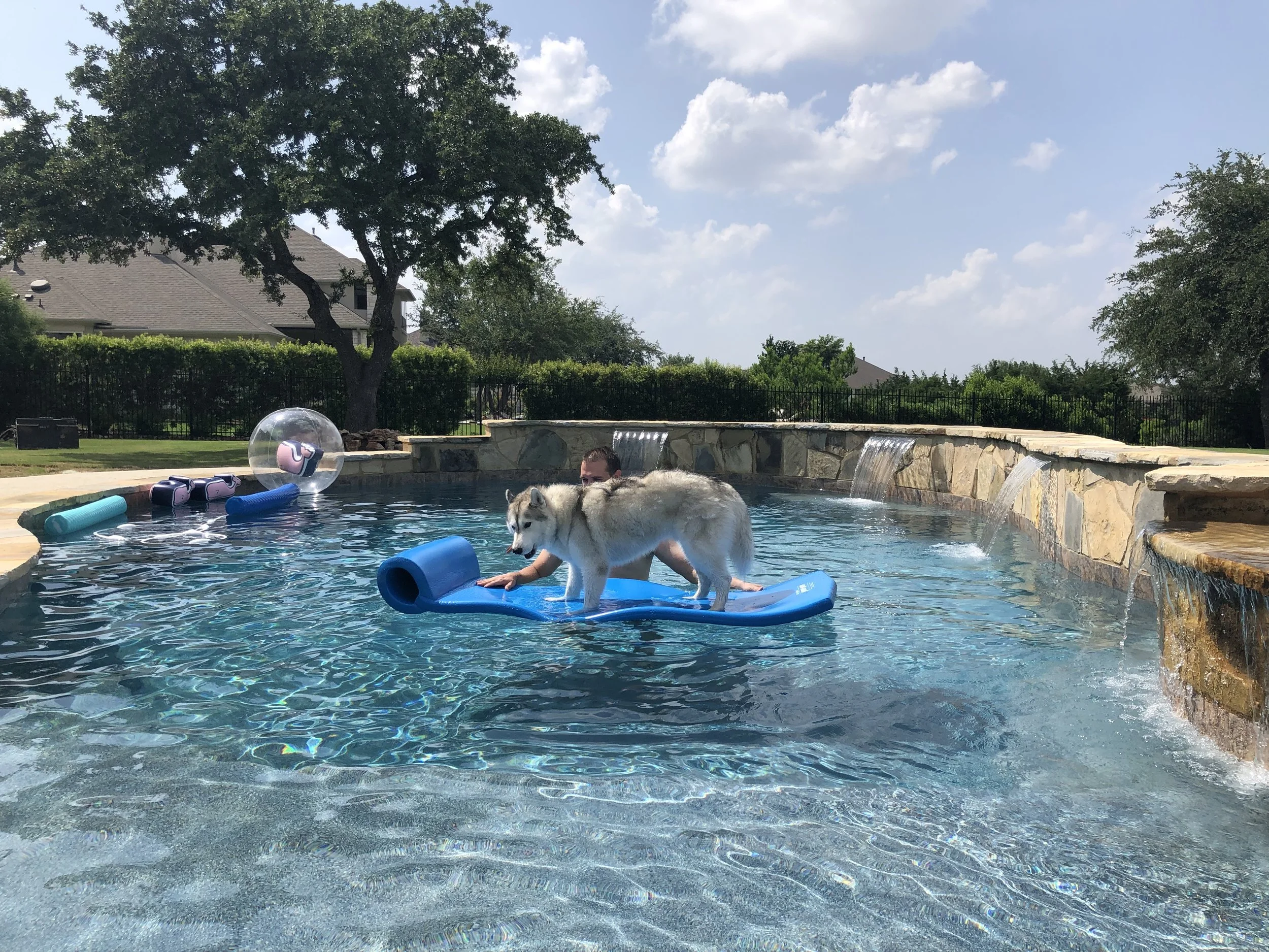 David tried to get Gus to float around on the pool float, but Gus wouldn’t lie down, so he ended up surfing on a pool float. (Yes, that’s a bully stick he’s trying to get on the pool float. That was our bribery to get him to cooperate.)