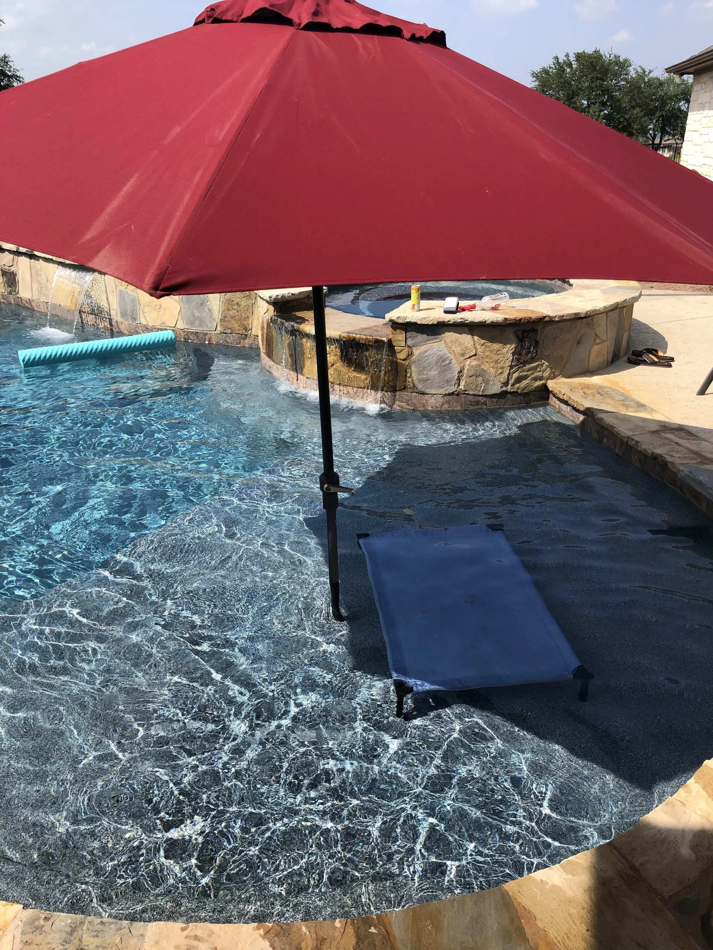 Finally, David set up this lovely dog spa on the ledge and no dog wanted to use it. We noticed that Kat tried to lie down on the ledge, but it’s too deep for her to do so (it’s about 12-inches of water), so we got out a cot dog bed so she would just have about 6-inches of water. Then David put up the umbrella so she would have shade. The things we do for them that they don’t appreciate!!